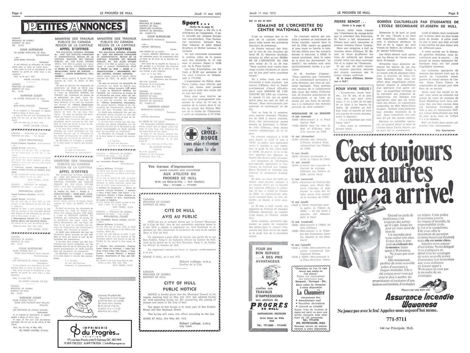 A renowned historian of the Outaouais region does not hesitate to say "that all the important events in the life of Hull between 1924 and 1972 went through the presses of the Imprimerie du Progrès". In 1972, the founders and owners of the newspaper decided to abandon publication in order to concentrate on commercial printing activities.